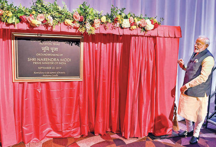 ஹூஸ்டன் ஹவ்டி மோடி நிகழ்ச்சிக்குப் பின், நேற்று (செப்டம்பர் 23) காந்தியடிகள் அருங்காட்சியகத்துக்கு அடிக்கல் நாட்டிய மோடி, “எனக்காக நீங்கள் ஒன்று செய்ய வேண்டும். உங்களால் முடியும். இது சிறிய வேண்டுகோள்தான். ஒவ்வொரு ஆண்டும், உங்கள் மூலமாக குறைந்தபட்சம் இந்தியர் அல்லாத ஐந்து வெளிநாட்டுக் குடும்பங்களாவது இந்தியாவுக்குச் சுற்றுலா வர வேண்டும். இதுபற்றி நீங்கள் உங்களுக்குள் ஆலோசித்து ஒரு நல்ல முடிவெடுங்கள். இந்த காந்தியடிகள் அருங்காட்சியகமானது ஹூஸ்டனில் மதிப்புமிக்க கலாச்சார மைல்கல்லாக இருக்கும். இந்தத் திட்டத்துடன் சில காலம் நானும் இணைந்து செயல்பட்டேன். காந்தியடிகளின் சிந்தனைகளை இளைஞர்கள் மத்தியில் பரப்புவதற்கு நிச்சயம் இந்த அருங்காட்சியகம் உதவிகரமாக அமையும்” என்று தெரிவித்தார் மோடி.