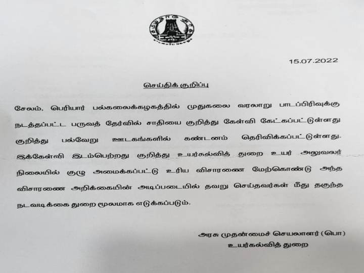 இந்த நிலையில், பெரியார் பல்கலைக் கழக வினாத்தாளில் சர்ச்சையான கேள்வி இடம் பெற்ற விவகாரம் தொடர்பாக விசாரணைக்கு தமிழக அரசு உத்தரவிட்டுள்ளது. அதுகுறித்த அறிக்கையில்,’சேலம் பெரியார் பல்கலைக் கழகத்தில் முதுகலை வரலாறு பாடப்பிரிவுக்கு நடத்தப்பட்ட பருவத் தேர்வில் சாதியை குறித்து கேள்வி கேட்கப்பட்டுள்ளது குறித்து பல்வேறு ஊடகங்களில் கண்டனம் தெரிவிக்கப்பட்டுள்ளது. இக்கேள்வி இடம்பெற்றது குறித்து உயர்கல்வித் துறை உயர் அலுவலர் நிலையில் குழு அமைக்கப்பட்டு உரிய விசாரணை மேற்கொண்டு அந்த விசாரணை அறிக்கையின் அடிப்படையில் தவறு செய்தவர்கள் மீது தகுந்த நடவடிக்கை, துறை மூலமாக எடுக்கப்படும்’ என்று தெரிவிக்கப்பட்டுள்ளது.