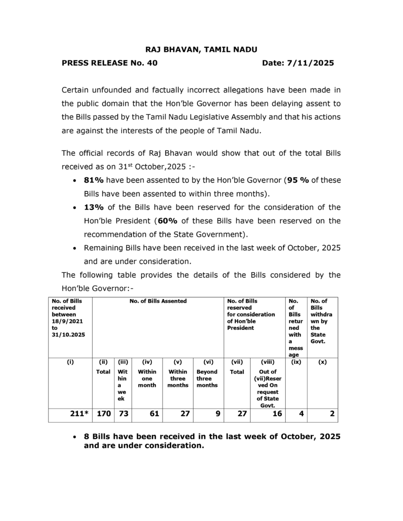 அக்டோபர் 31, 2025 வரை ஆளுநர் மாளிகையால் பெறப்பட்ட மசோதாக்களில் 81% மசோதாக்கள் ஆளுநரால் ஒப்புதல் அளிக்கப்பட்டுள்ளன. (இவற்றில் 95% மசோதாக்களுக்கு மூன்று மாதங்களுக்குள் ஒப்புதல் அளிக்கப்பட்டுள்ளது.) 13% மசோதாக்கள் குடியரசுத் தலைவரின் பரிசீலனைக்காக அனுப்பி வைக்கப்பட்டுள்ளன (இவற்றில் 60% மசோதாக்கள் மாநில அரசின் பரிந்துரையின் பேரில் அனுப்பி வைக்கப்பட்டுள்ளன). மீதமுள்ள மசோதாக்கள் அக்டோபர், 2025-இன் இறுதி வாரத்தில் பெறப்பட்டு, பரிசீலனையில் உள்ளன.