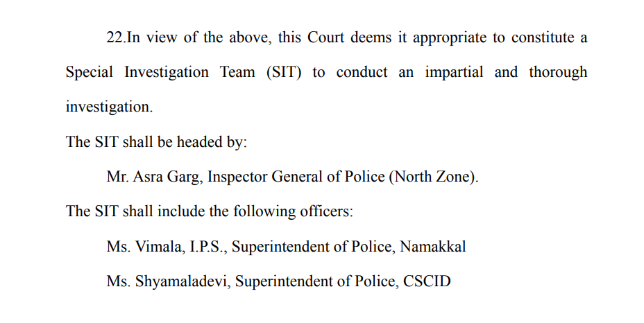 அதன்படி இந்த சிறப்பு புலனாய்வு குழுவில் ஐ.ஜி. அஸ்ரா கார்க் தவிர்த்து நாமக்கல் காவல் கண்காணிப்பாளர் விமலா ஐபிஎஸ் மற்றும் காவல் கண்காணிப்பாளர் சியாமளாதேவி ஆகியோரும் இடம்பெற்றுள்ளது தற்போது தெரியவந்துள்ளது.