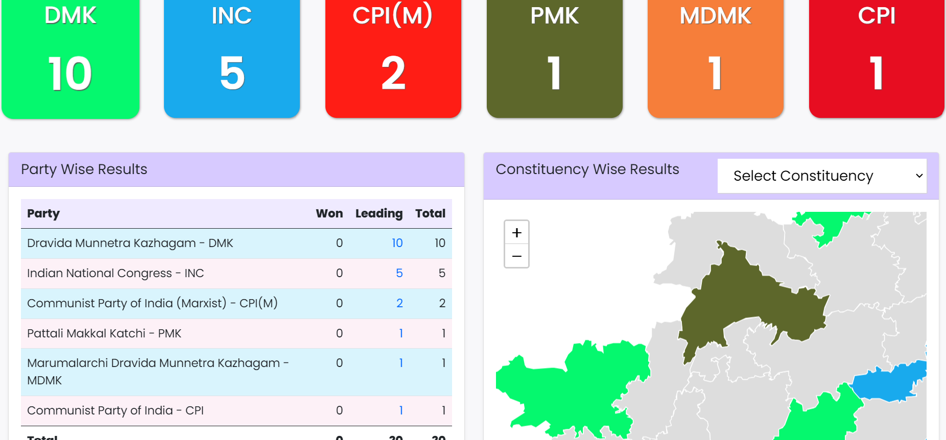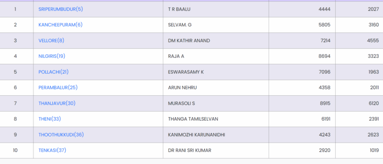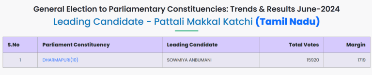 தமிழகத்தில் 39 தொகுதிகளில் 10 தொகுதிகளில் திமுகவும், 5 இடங்களில் காங்கிரஸும், சிபிஐ-எம் – 2 இடங்களிலும், மதிமுக, பாமக, சிபிஐ தலா ஒரு இடத்திலும் முன்னிலையில் இருக்கின்றன என தேர்தல் ஆணையம் அதிகாரப்பூர்வமாக அறிவித்துள்ளது.