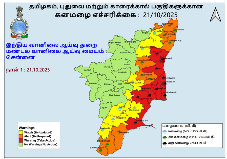 வங்கக்கடலில் காற்றழுத்த தாழ்வு பகுதி உருவாகி இருக்கும் சூழலில் இராமநாதபுரம், புதுக்கோட்டை, தஞ்சாவூர், திருவாரூர், நாகப்பட்டினம், மயிலாடுதுறை, விழுப்புரம், கடலூர் மாவட்டங்கள், புதுவை மற்றும் காரைக்கால் பகுதிகளில் ஒருசில இடங்களில் கன முதல் மிக கனமழையும், ஓரிரு இடங்களில் அதி கன மழையும்,