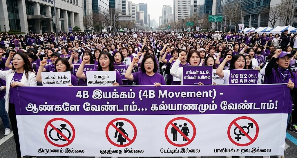 தென் கொரியாவில் தொடங்கிய ஒரு தீப்பொறி, இன்று உலகம் முழுவதும் காட்டுத்தீயாகப் பரவி வருகிறது. “ஆண்களை நாங்கள் வெறுக்கவில்லை; ஆனால் அவர்களின் அடக்குமுறை எங்களுக்குத் தேவையில்லை,” என்று லட்சக்கணக்கான பெண்கள் ஒரே குரலில் முழங்கும் இந்த இயக்கத்தின் பெயர் – ‘4B இயக்கம்’ (4B Movement).