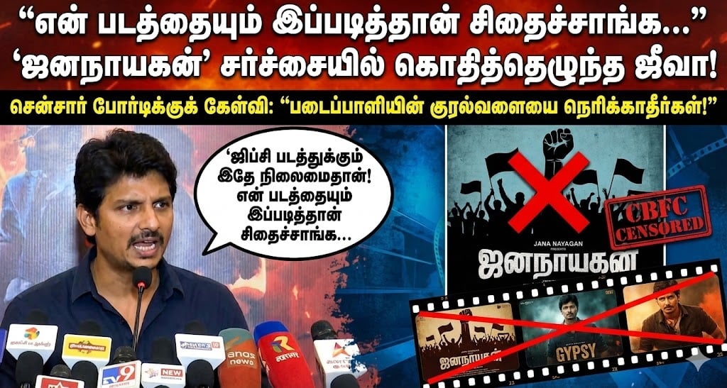சினிமாவில் ஒரு படம் சர்ச்சையில் சிக்கினால், மற்ற நடிகர்கள் பெரும்பாலும் அமைதி காப்பதே வழக்கம். “நமக்கெதுக்கு வம்பு?” என்று ஒதுங்கிவிடுவார்கள். ஆனால், நடிகர் ஜீவா இன்று அந்த மௌனத்தைக் கலைத்து, சர்ச்சையில் சிக்கியுள்ள ‘ஜனநாயகன்’ (Jana Nayagan) படத்திற்கு ஆதரவாகக் களமிறங்கியுள்ளார். “தணிக்கை என்ற பெயரில் ஒரு படைப்பாளியின் குரல்வளையை நெரிக்காதீர்கள்” என்று அவர் பேசியது கோலிவுட்டில் அதிர்வலைகளை ஏற்படுத்தியுள்ளது.