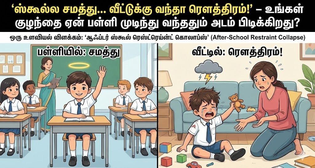 கவலை வேண்டாம். உங்கள் குழந்தை செய்வது நாடகம் அல்ல. இதற்குப் பெயர்தான் ‘ஆஃப்டர் ஸ்கூல் ரெஸ்ட்ரெய்ன்ட் கொலாப்ஸ்’ (After-School Restraint Collapse).