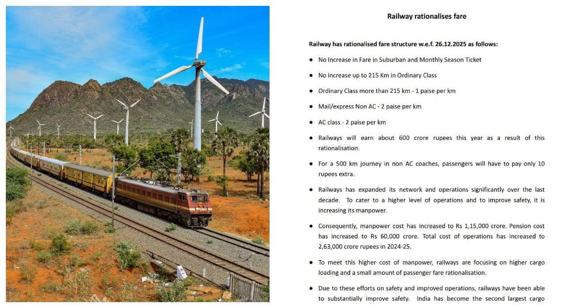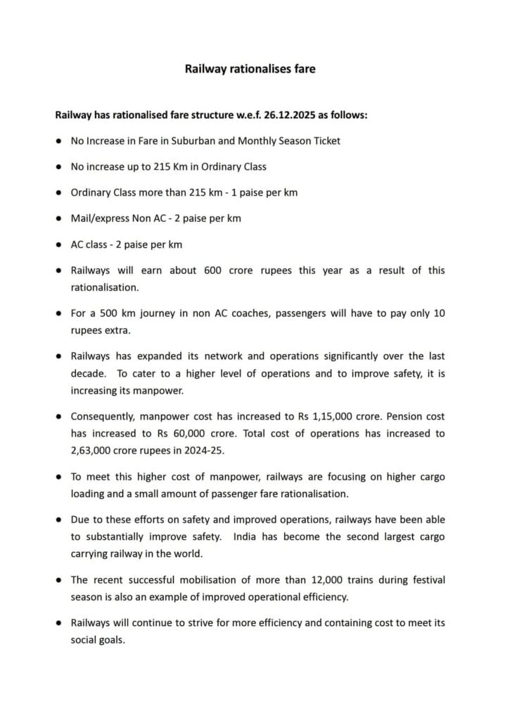 - புறநகர் ரயில்கள் (Suburban) மற்றும் மாதாந்திர சீசன் டிக்கெட் (MST) கட்டணங்களில் எந்த மாற்றமும் இல்லை.