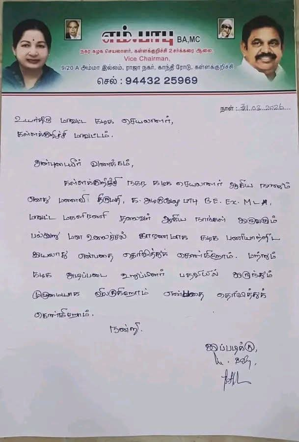 அவர் மாவட்டச் செயலாளரிடம் அளித்த கடிதத்தில், கள்ளக்குறிச்சி நகர செயலாளராகிய நானும், எனது மனைவியும் முன்னாள் எம்.எல்.ஏ.வும் மாவட்ட மகளிரணி தலைவராகிய அழகுவேல் பாபுவும் மன உளைச்சலால் கழக பணியாற்றிட இயலாது. எனவே அடிப்படை உறுப்பினர் பதவியில் இருந்து இருவரும் விலகுகிறோம்” என்று தெரிவிக்கப்பட்டுள்ளது.