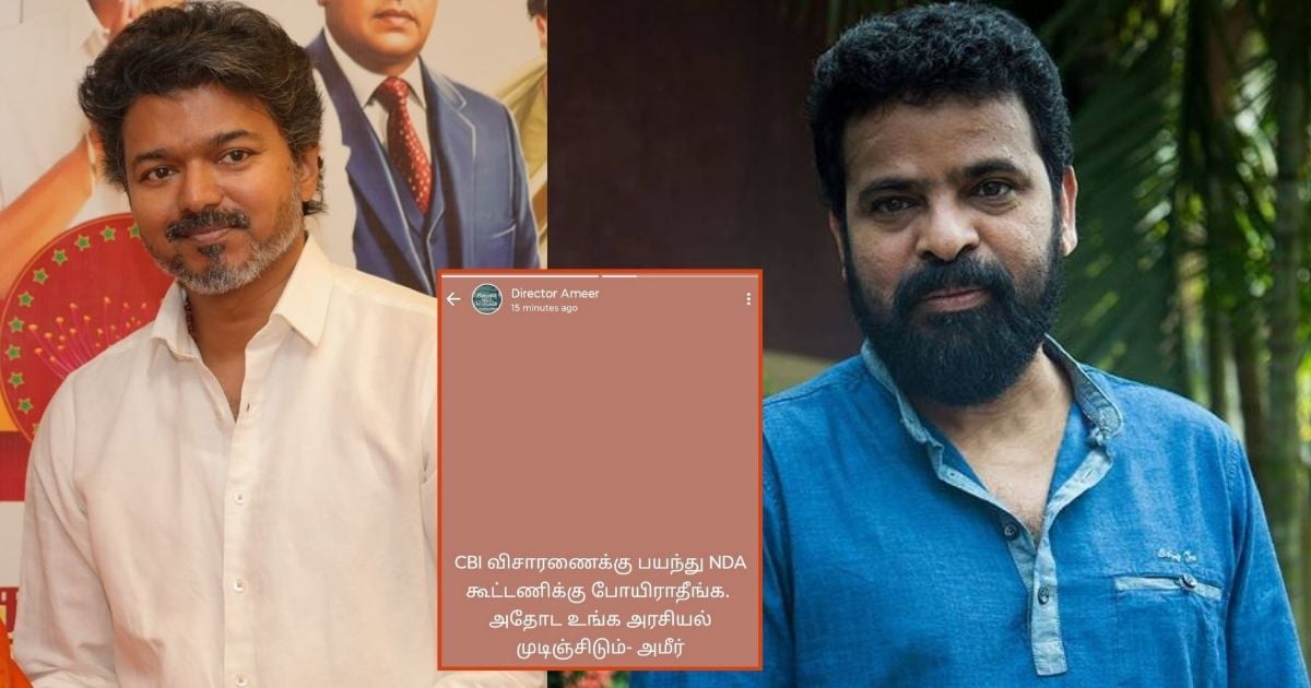 சிபிஐ விசாரணைக்கு பயந்து தேசிய ஜனநாயகக் கூட்டணியில் இணைந்து விட வேண்டாம் என்று விஜயை குறிப்பிடாமல் இயக்குநர் அமீர் வாட்ஸ்அப் ஸ்டேட்டஸ் வைத்துள்ளது பேசு பொருளாகி உள்ளது.