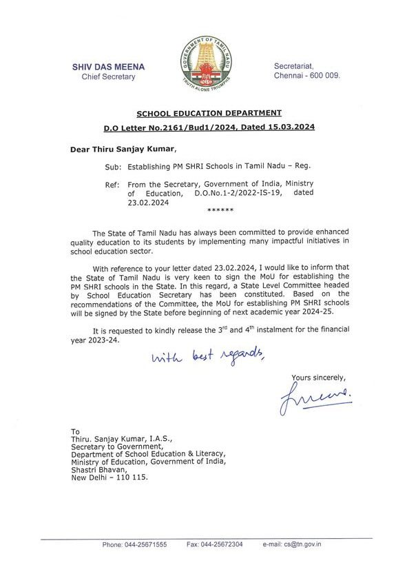 எங்களது “நிலைப்பாட்டில் திடீர் மாற்றம்” இல்லை. 15/3/2024 தேதியிட்ட கடிதம் புதிய கல்விக் கொள்கையை அங்கீகரிப்பதாக இல்லை. மாணவர்களுக்கு நன்மை பயக்கும் போது மட்டுமே தமிழக அரசு மத்திய திட்டங்களை அமல்படுத்துகிறது. எந்தவொரு திட்டத்தையும் அல்லது கட்டமைப்பையும் குருட்டுத்தனமாக ஏற்றுக்கொள்வதில்லை.