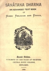 அதற்கு மாறாக சனாதன தர்மம் என்றால் என்ன என்று புரிந்துகொள்ள உதவியாக அறிஞர் பொ.வேல்சாமி முகநூலில் பகிர்ந்திருந்த 1907ஆம் ஆண்டு வெளியான நூலைப் பார்க்கலாம். இந்த நூலை பலரும் தொலைக்காட்சி விவாதங்களில் மேற்கோள் காட்டுகிறார்கள். இந்த நூலானது “காசிப்பிரதான ஹிந்து வித்யாசாலையின் சம்ரஷணை கமிட்டியார் தம் ஆட்சிக்குட்பட்ட சகல வித்யாசாலைகளிலும் சிறுவர்க்கு மதம், நீதி இவ்விஷயங்கள் கற்பிக்கப்படுவதற்கு” உருவாக்கியது. மூலம் எந்த மொழியில் இருந்தது என்று தெரியாவிட்டாலும், தமிழில் மொழியாக்கம் செய்து 1907ஆம் ஆண்டு “ஸனாதன தர்மம்” என்ற பெயரில் பிராட்வே மினர்வா பிரஸ்ஸில் அச்சடிக்கப்பட்டதான குறிப்புடன் பிரசுரிக்கப்பட்டுள்ளது.