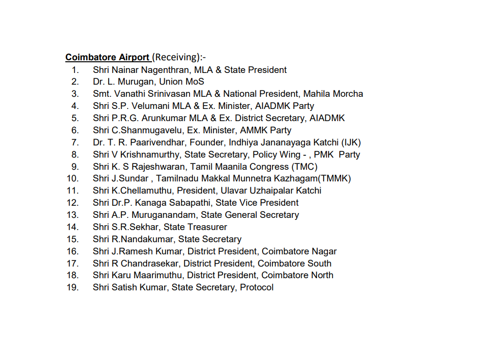 விமான நிலையத்தில் செய்தியாளர்களிடம் பேசிய வானதி சீனிவாசன், “வரவேற்பாளர்கள் பட்டியலில் அண்ணாமலையின் பெயர் இருந்தது. ஆனால் அவர்தான் வரவில்லை” என்று தெரிவித்தார். ஆனால் பிரதமரை வரவேற்கும் பட்டியலில் அண்ணாமலையின் பெயர் இடம் பெறவில்லை என்ற தகவல்கள் வெளியாகி உள்ளது.