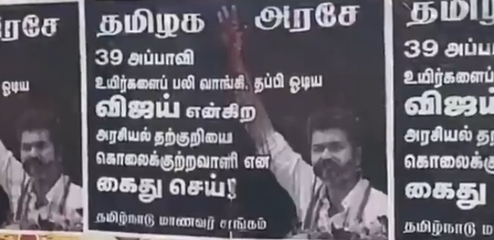 இந்த சம்பவத்தைத் தொடர்ந்து நடிகர் விஜய்யின் பனையூர் வீட்டை முற்றுகையிட்டு தமிழக மாணவர் மன்றத்தினர் நேற்று (செப்டம்பர் 28) போராட்டம் நடத்தினர். இந்த நிலையில் நடிகர் விஜய்யை கைது செய்ய வலியுறுத்தி சென்னை மாநகரின் பல இடங்களில் தமிழக மாணவர் மன்றத்தினர் போஸ்டர்களை ஒட்டி உள்ளது பரபரப்பை ஏற்படுத்தி உள்ளது.