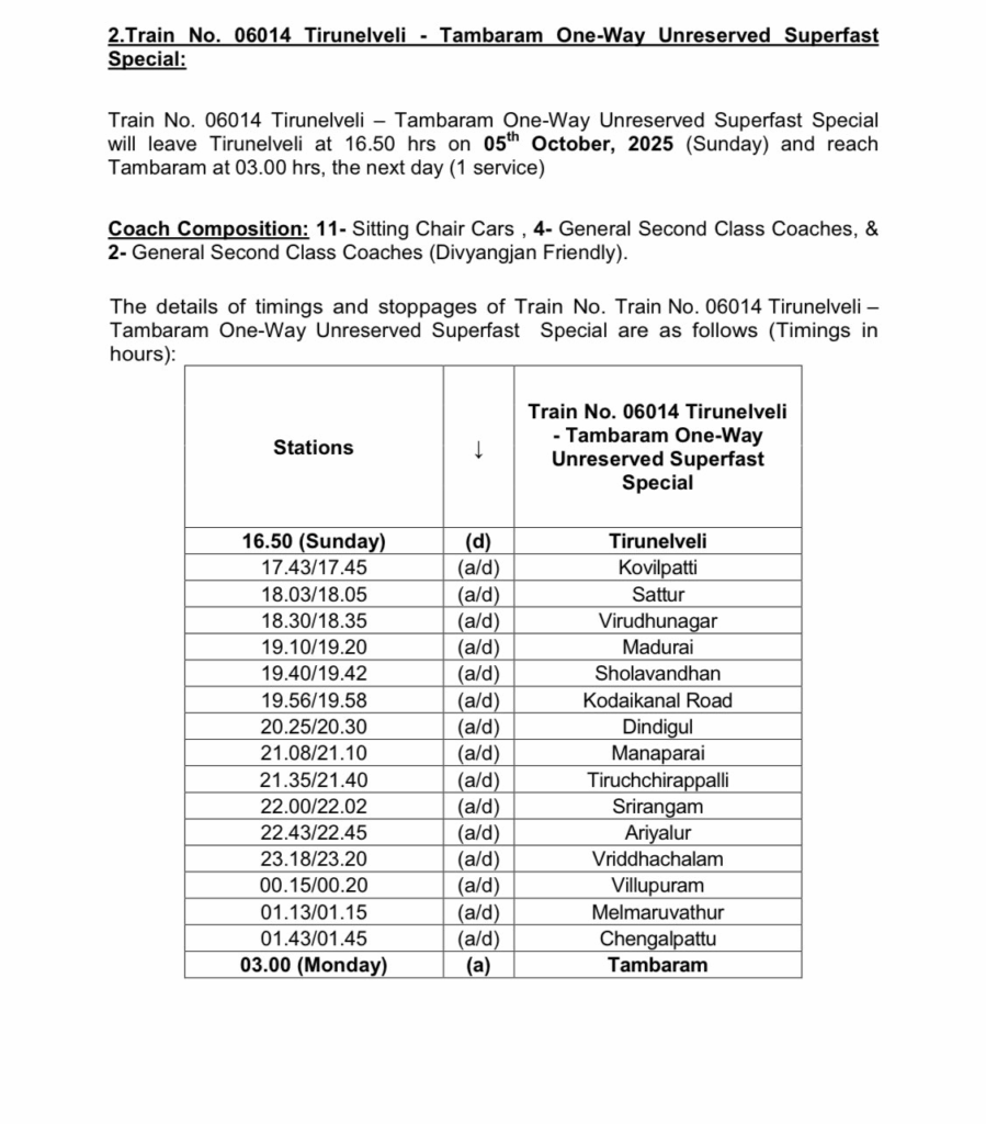 அதன்படி நெல்லை – தாம்பரம் இடையே முன்பதிவு இல்லாத சிறப்பு ரயில் அக்டோபர் 5ஆம் தேதி (ஞாயிற்றுக்கிழமை) இயக்கப்படும் என்று அறிவித்துள்ளது.