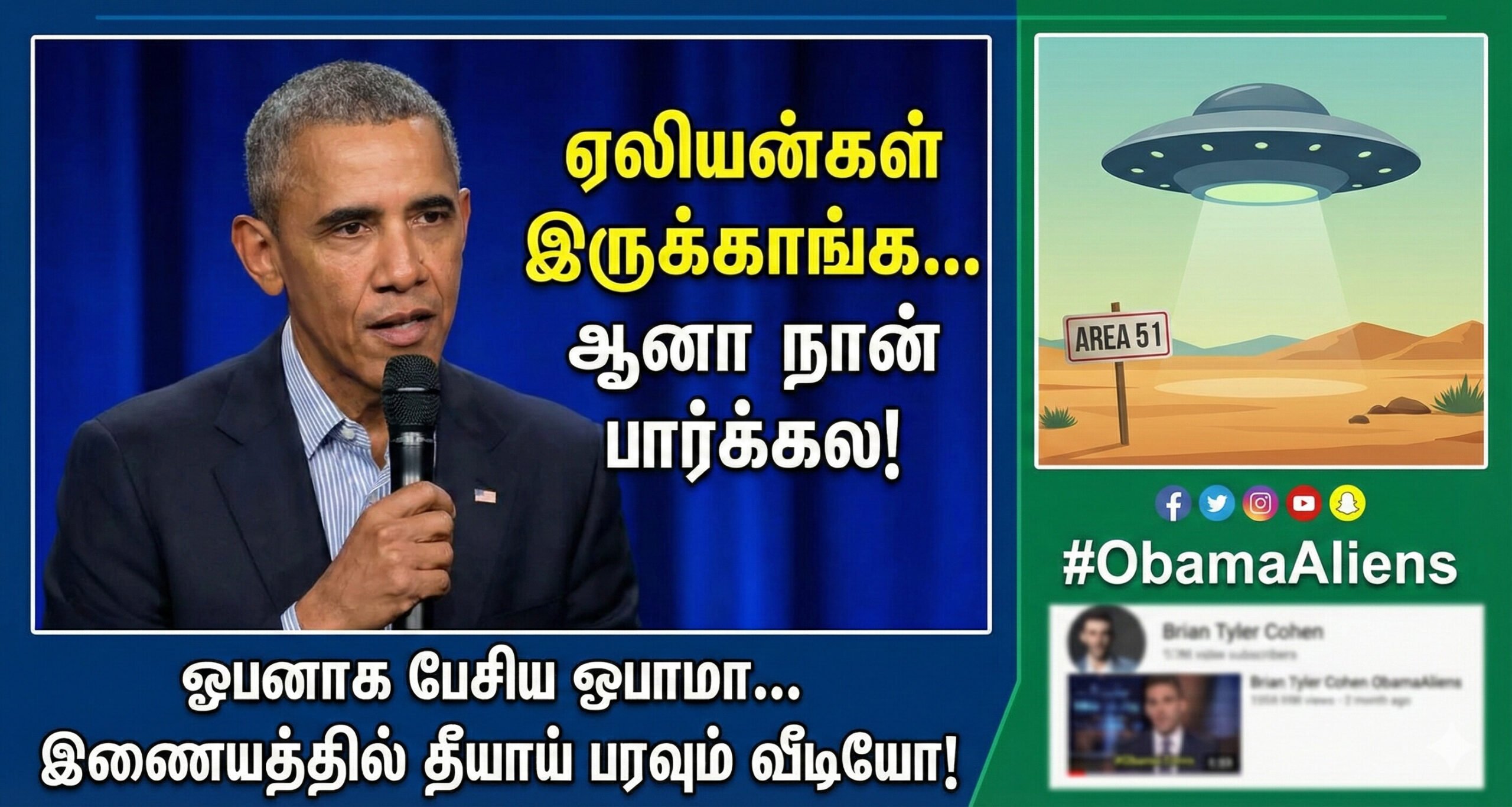பிரபல யூடியூபர் பிரையன் டைலர் கோஹன் (Brian Tyler Cohen) நடத்திய பாட்காஸ்ட் நிகழ்ச்சியில் கலந்து கொண்ட ஒபாமாவிடம், “ஏலியன்கள் உண்மையா?” என்ற கேள்வி முன்வைக்கப்பட்டது. அதற்கு அவர் அளித்த பதில், “ஆம், அவை உண்மையானவை” (They’re real).