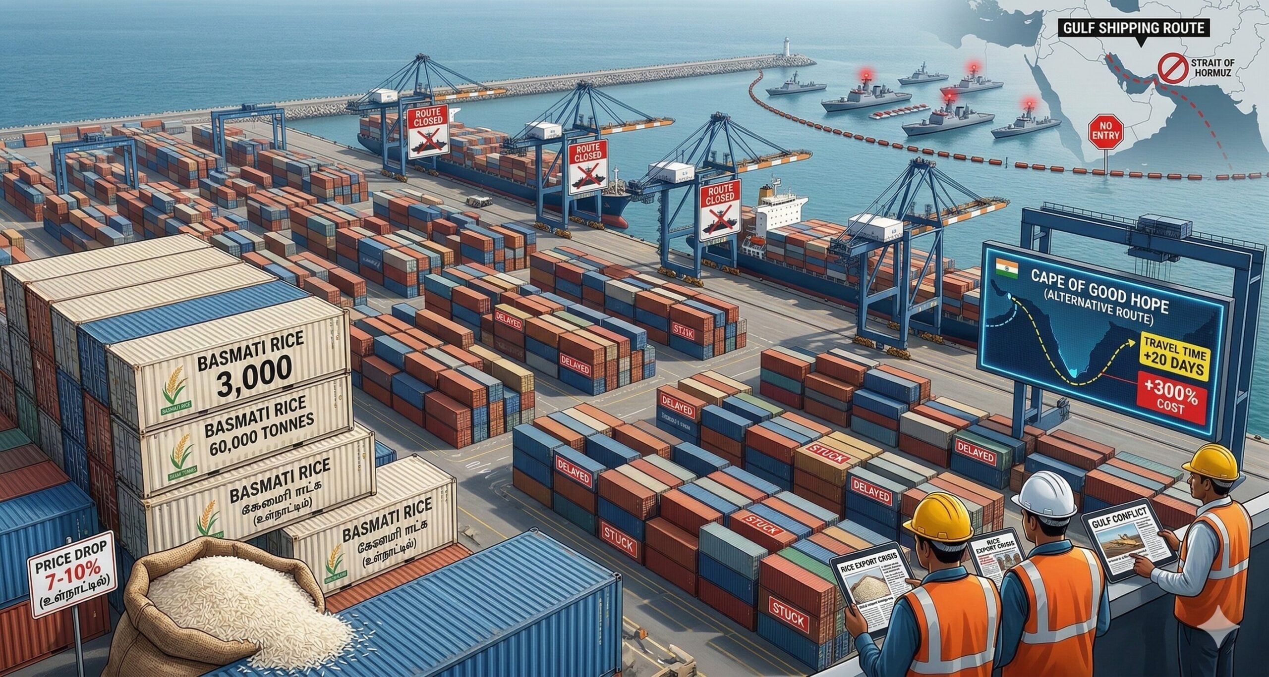 மத்திய கிழக்கு நாடுகளில் நிலவி வரும் போர் பதற்றம் காரணமாக, இந்தியாவிலிருந்து ஏற்றுமதி செய்யப்பட வேண்டிய சுமார் 60,000 டன் Basmati Rice (பாசுமதி அரிசி) பல்வேறு Indian Ports (இந்தியத் துறைமுகங்கள்) மற்றும் சரக்கு முனையங்களில் தேங்கிக் கிடக்கின்றன. வளைகுடா பிராந்தியத்தின் மிக முக்கியமான Gulf Shipping Route (வளைகுடா கப்பல் போக்குவரத்து வழித்தடம்) மற்றும் ஹார்முஸ் நீரிணை (Strait of Hormuz) பகுதிகளில் கப்பல் போக்குவரத்து முடங்கியுள்ளதால், இந்த இக்கட்டான சூழல் ஏற்பட்டுள்ளது. இதனால் இந்திய அரிசி ஏற்றுமதியாளர்கள் பல கோடி ரூபாய் நஷ்டத்தைச் சந்திக்கும் அபாயம் உருவாகியுள்ளது.