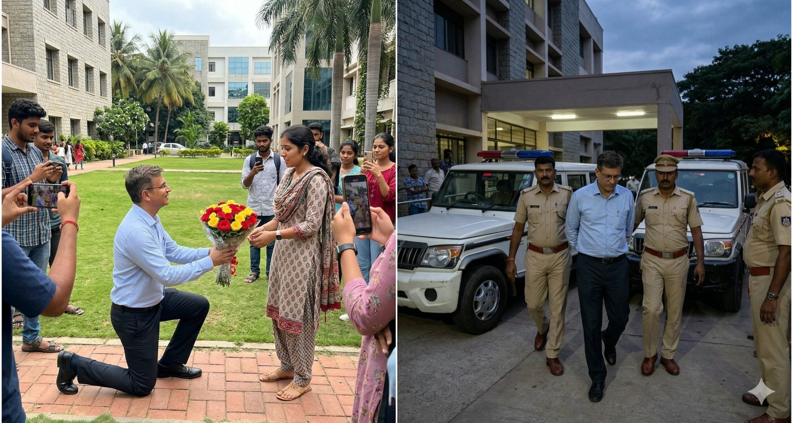 பெங்களூருவில் உள்ள ஒரு தனியார் கல்லூரியில் நிகழ்ந்த இந்தச் சம்பவம், 2026-ம் ஆண்டின் சமூக வலைதளங்களில் மிகப்பெரிய விவாதப் பொருளாக மாறியுள்ளது. ஒரு பேராசிரியர் தனது மாணவியிடம் வளாகத்திற்குள்ளேயே (On-campus) மண்டியிட்டு காதல் முன்மொழிவு (Proposal) செய்த வீடியோ வைரலானதைத் தொடர்ந்து, அந்தப் பேராசிரியர் தற்போது காவல்துறையினரால் கைது செய்யப்பட்டுள்ளார்.