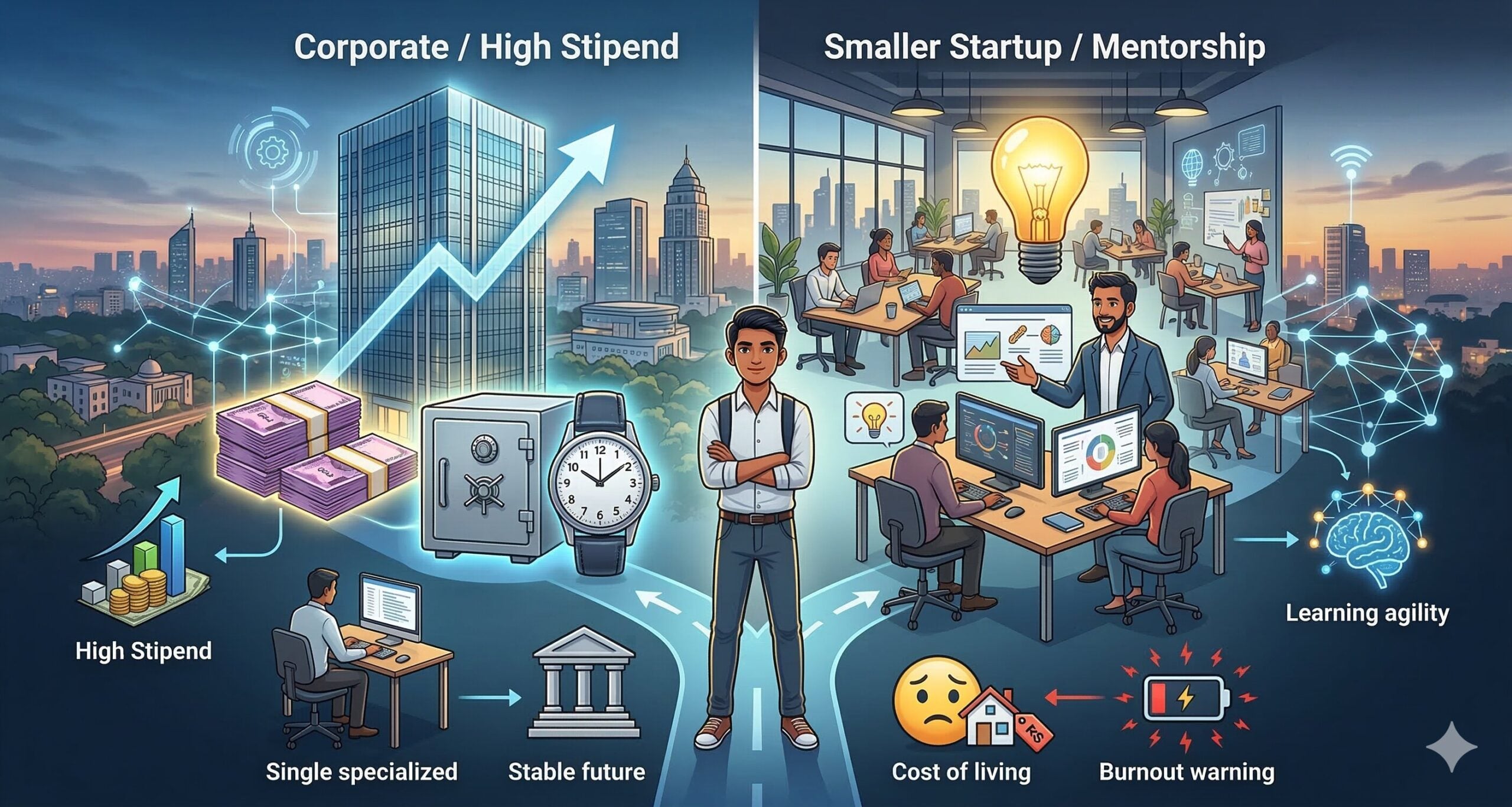 - வாதம்: “வாழ்க்கையின் தொடக்கத்தில் பணத்தை விட அறிவும் அனுபவமும்தான் முக்கியம். ஒரு நல்ல வழிகாட்டியின் கீழ் பணிபுரிவது எதிர்காலத்தில் கோடிக்கணக்கில் சம்பாதிக்க உதவும் முதலீடு போன்றது.”