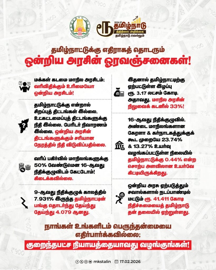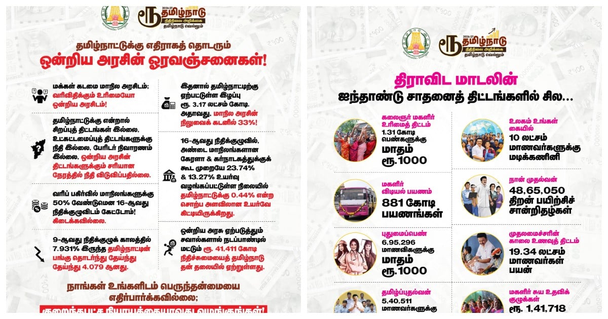தமிழ்நாடு அரசின் சாதனைகளையும் மத்திய அரசின் ஓரவஞ்சனைகளையும் முதல்வர் மு.க.ஸ்டாலின் பட்டியலிட்டு வெளியிட்டுள்ளார்.