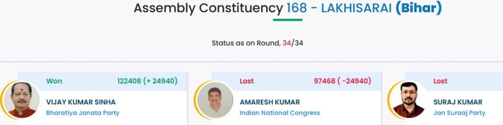 விஜயகுமார் சின்ஹா LakhiSarai தொகுதியில் 1,22,408 வாக்குகளைப் பெற்றுள்ளனர்.