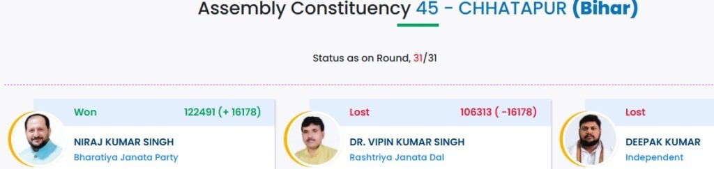 நிராஜ்குமார் சிங் சிங் Chhatapur தொகுதியில் 1,22,491