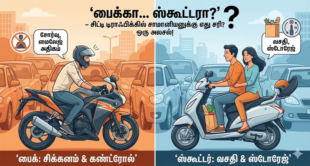 சினிமாவில் ஹீரோ கெத்தாக பைக் ஓட்டுவதைப் பார்க்க நன்றாகத்தான் இருக்கும். ஆனால், காலை 9 மணி டிராஃபிக்கில், ஆமை வேகத்தில் நகரும்போதுதான் தெரியும் எது சிறந்தது என்று. 2026-ம் ஆண்டு நகரத்துச் சூழலில் எது உங்களுக்கு ஏற்றது? இதோ ஒரு ஒப்பீடு.