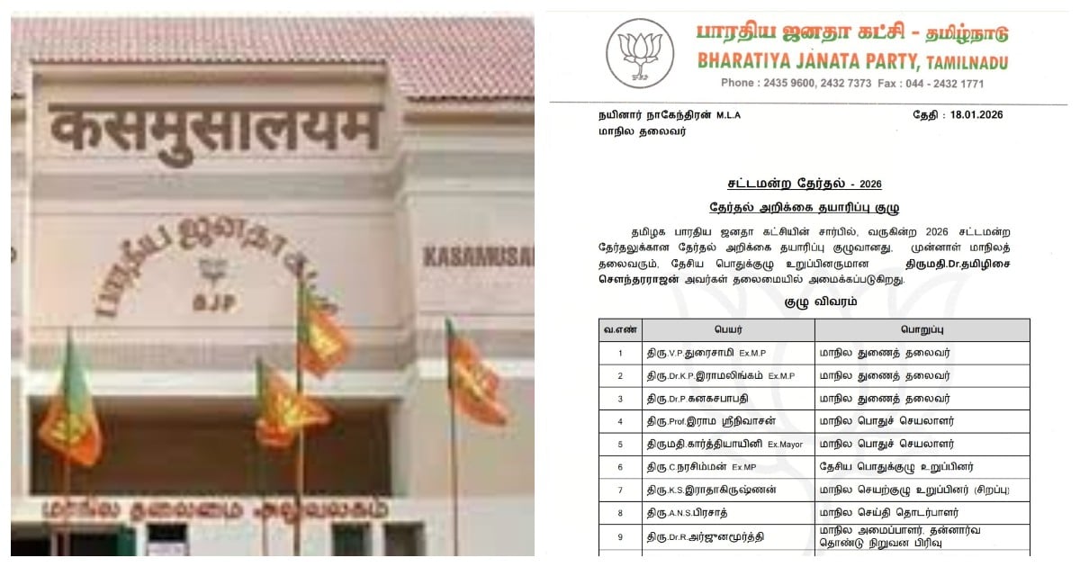 2026 தமிழக சட்டப்பேரவை தேர்தலுக்கான பாஜகவின் தேர்தல் அறிக்கை தயாரிப்பு குழு அறிவிக்கப்பட்டுள்ளது.