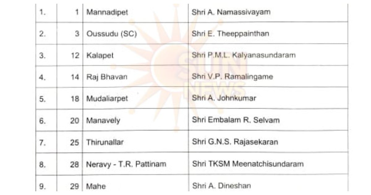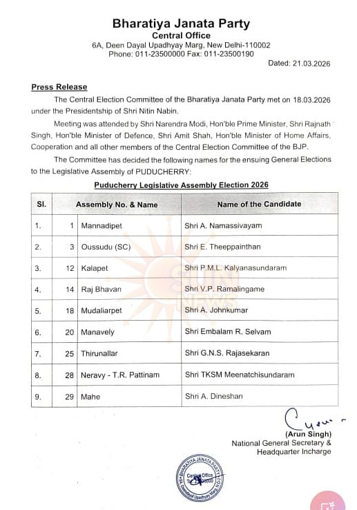 புதுச்சேரியில் 10 சட்டசபை தொகுதிகளில் போட்டியிடும் பாஜக 9 தொகுதிகளுக்கான வேட்பாளர்களை இன்று மார்ச் 21ந்- தேதி அறிவித்துள்ளது.