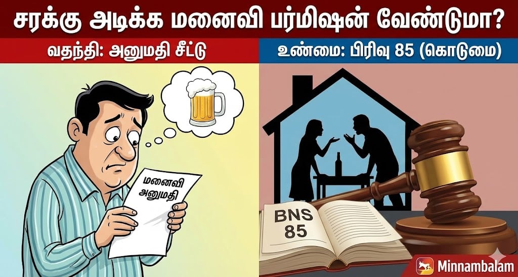 கடந்த சில நாட்களாக வாட்ஸ்அப் மற்றும் சமூக வலைத்தளங்களில் ஆண்களை, குறிப்பாகக் கணவன்மார்களைக் கதிகலங்க வைக்கும் ஒரு செய்தி பரவி வருகிறது. “புதிய சட்டப்படி (BNS), இனி கணவன் மது அருந்த வேண்டுமென்றால் மனைவியிடம் அனுமதி வாங்க வேண்டும். இல்லையென்றால் 3 வருடம் ஜெயில்!” என்பதுதான் அந்தத் தகவல்.