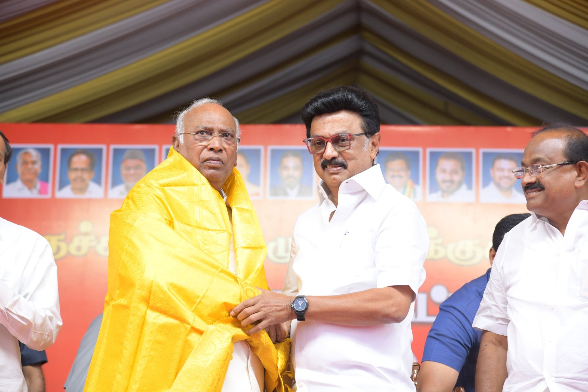 காங்கிரஸ் கட்சியினுடைய தேசிய தலைவர் மல்லிகார்ஜுன் கார்கே வந்திருக்கிறார். நம்முடைய மதச்சார்பற்ற முற்போக்கு கூட்டணி இந்த அளவு வலிமையாக தொடர்வதற்கு அடித்தளமாக இருக்கக்கூடிய மூத்த தலைவர் அவர். அதேபோல நேற்று அன்பிற்கினிய சகோதரர் ராகுல் காந்தியும் தமிழ்நாடு வந்து பிரச்சாரம் செய்துவிட்டு போயிருக்கிறார்.