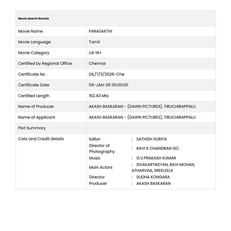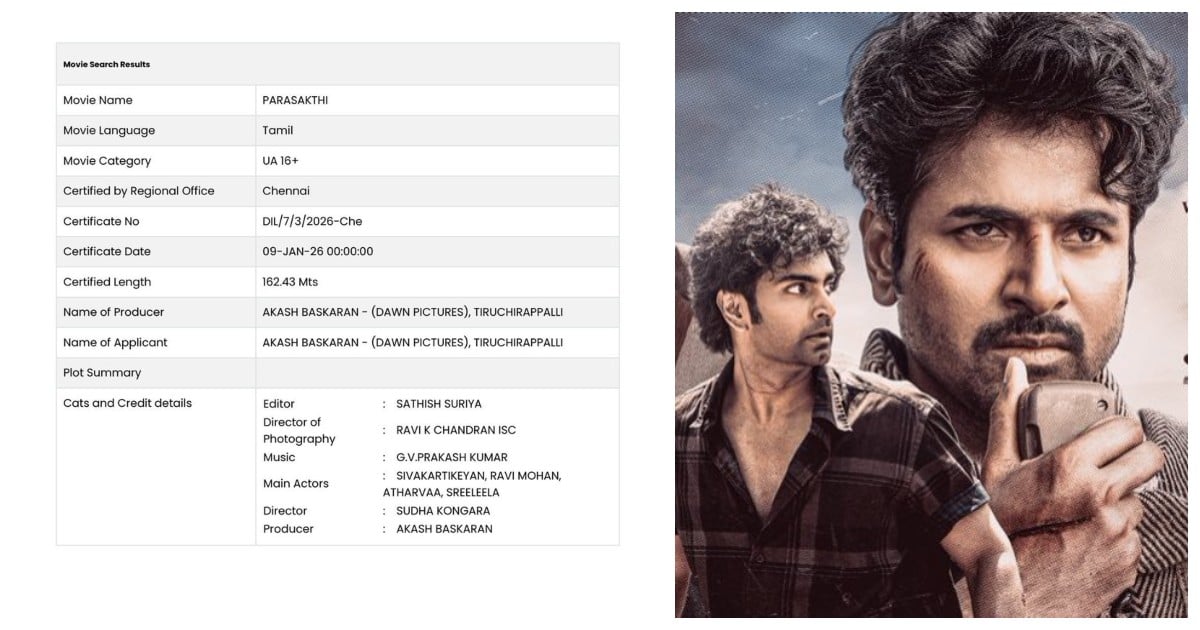 இத்திரைப்படம் மிகப் பெரும் எதிர்பார்ப்பை ஏற்படுத்தியுள்ள நிலையில் மத்திய திரைப்பட தணிக்கை வாரியம் U/A சான்றிதழ் வழங்கியுள்ளது. இதனையடுத்து ஏற்கனவே திட்டமிட்டபடி நாளை ஜனவரி 10-ந் தேதி, பராசக்தி திரைப்படம் வெளியாகிறது.