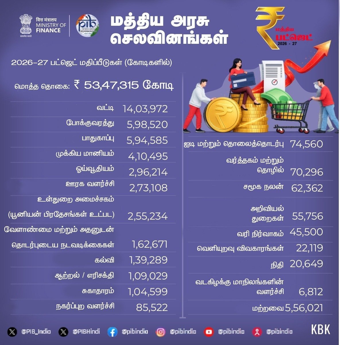 மொத்த பட்ஜெட் ஒதுக்கீடு ரூ.53.5 லட்சம் கோடி ஆகும். கடந்த ஆண்டை விட இது சுமார் 7.9% (ரூ.49.6 லட்சம் கோடி)அதிகமாகும்.