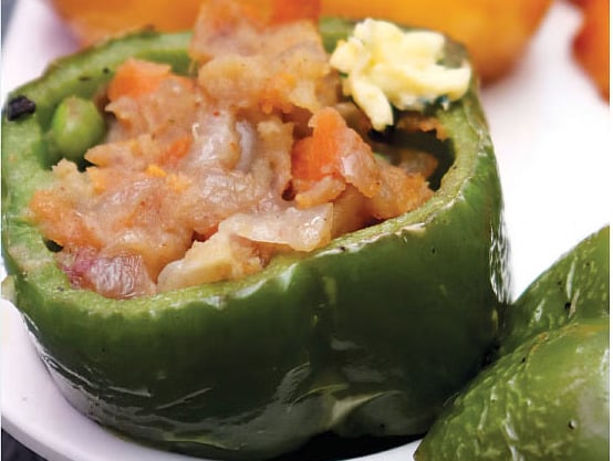 குடமிளகாயை எடுத்துக்கொண்டு மேற்புறம் (மூடி மாதிரி) வெட்டிக் கொள்ளவும் (பார்க்க படம்). கீழ்ப்புறம் (அடிபாகம்) இருக்கும் குடமிளகாயின் விதைகளை நீக்கிவிட்டு வெஜ் மசாலாவை நிரப்பவும், மூன்று குடமிளகாய்களில் நிரப்பிக்கொண்டு அதன் மீது சீஸைச் சரிசமமாகப் பிரித்துப்போடவும்.