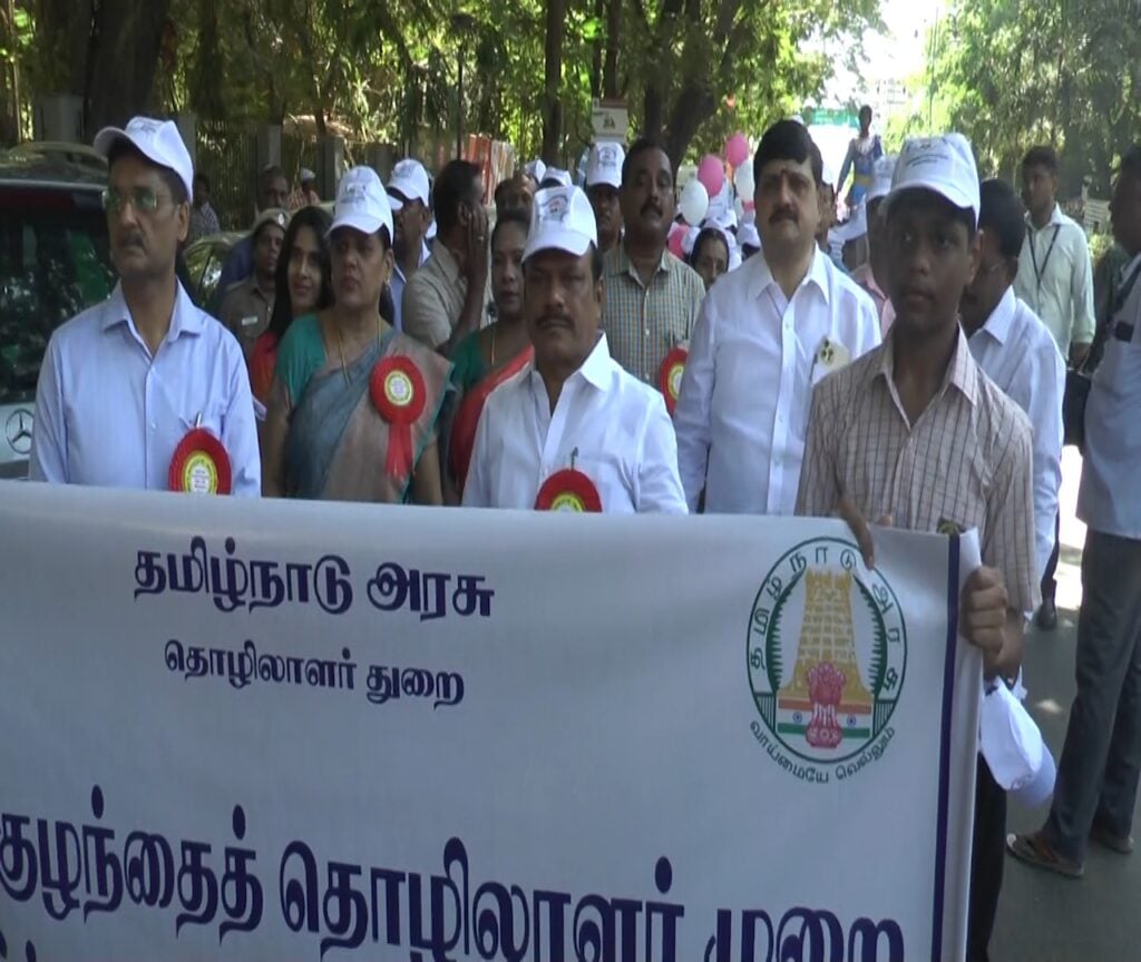 உலக குழந்தைத் தொழிலாளர் எதிர்ப்பு தினத்தையொட்டி சென்னை தியாகராய நகரில் உள்ள ஜீவா பூங்காவில் குழந்தை தொழிலாளர் எதிர்ப்பு விழிப்புணர்வு பேரணி நடைபெற்றது. 100க்கும் மேற்பட்ட பள்ளிக் குழந்தைகள் பங்கேற்ற பேரணியை தொழிலாளர் நலத்துறை அமைச்சர் சி.வி.கணேசன் இன்று (ஜூன் 12) தொடங்கி வைத்தார்.