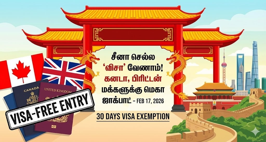 “என்னப்பா… ‘சீனா போயிட்டு வரணும், அங்க இருக்குற பிசினஸ் வாய்ப்புகளைப் பாக்கணும், கிரேட் வால் ஆஃப் சைனாவை நேர்ல ரசிக்கணும்’னு ஆசை இருக்கா? ஆனா விசா எடுக்கறதுக்குள்ள போதும் போதும்னு ஆகிடுதேனு கவலைப்படுறீங்களா? இப்போதைக்கு கனடா மற்றும் லண்டன்ல இருக்குற நம்ம தம்பி, தங்கச்சிகளுக்கு சீனா ஒரு சூப்பர் ‘லக்கி பிரைஸ்’ கொடுத்திருக்கு. விசா இல்லாமலேயே (visa free) இனி சீனாவுக்குள்ள கெத்தா போயிட்டு வரலாம்!”