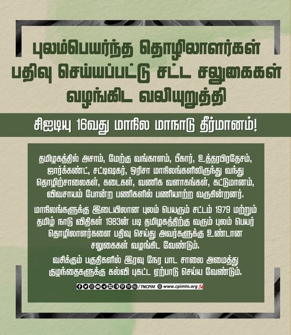 தமிழகத்தில் உள்ள புலம்பெயர்ந்த (வட இந்திய) தொழிலாளர்கள் பதிவு செய்யப்பட்டு அவர்களுக்கும் சட்ட சலுகைகள் வழங்கிட வேண்டும் என்று சிபிஎம் கட்சியின் தொழிற்சங்கமான சிஐடியூ-வின் 16வது மாநில மாநாட்டு தீர்மானம் நிறைவேற்றப்பட்டுள்ளது.
