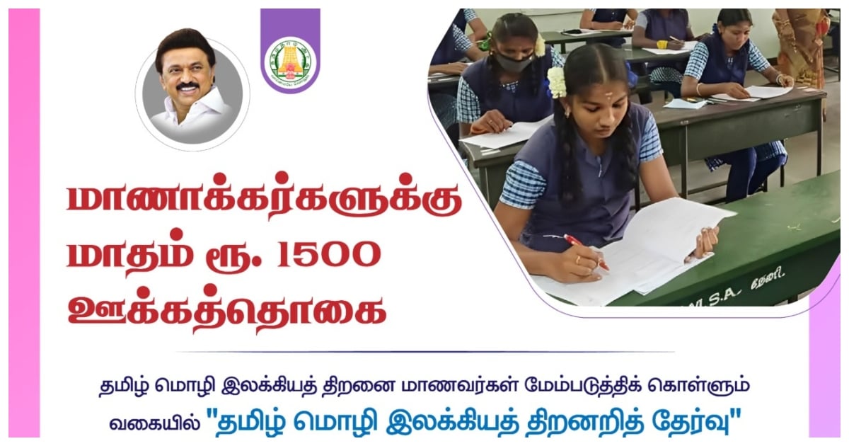 தமிழ்நாடு அரசின் ‘தமிழ் மொழி இலக்கிய திறனறித் தேர்வு’ எழுதி தேர்வானால் 11-ம் வகுப்பு மாணவர்களுக்கு மாதம் ரூ1,500 உதவி தொகை 2 ஆண்டுகளுக்கு வழங்கப்படும். இதற்கான விண்ணப்பங்களை தற்போது ஆன்லைனில் பதிவிறக்கம் செய்யலாம். இந்த விண்ணப்பங்களை அனுப்ப நாளை செப்டம்பர் 4-ந் தேதி கடைசி நாள்.