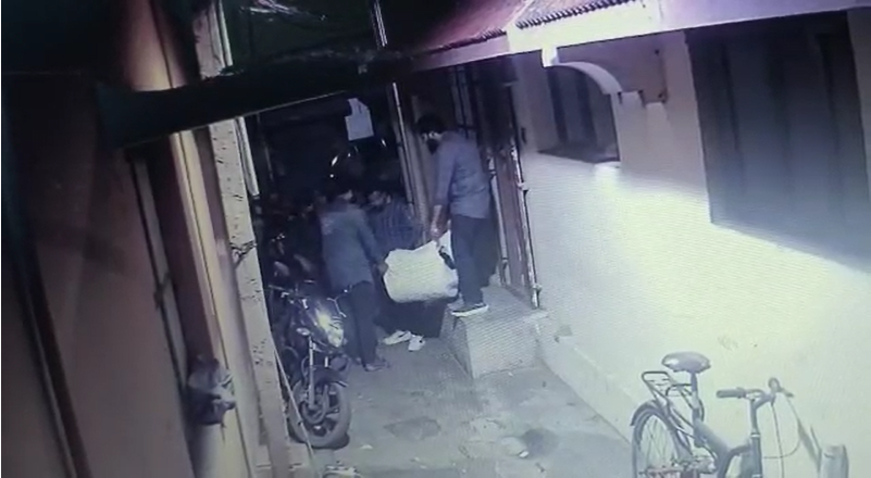 பின்னர் நான்கு பேர், சாக்குப்பையின் நான்கு முனைகளை பிடித்து, அதில் உள்ள கருப்பு நிற மர்ம பொருளை எடுத்து செல்கின்றனர். இந்த காட்சி இரவு 11 .25 மணியளவில் பதிவாகி உள்ளது.
