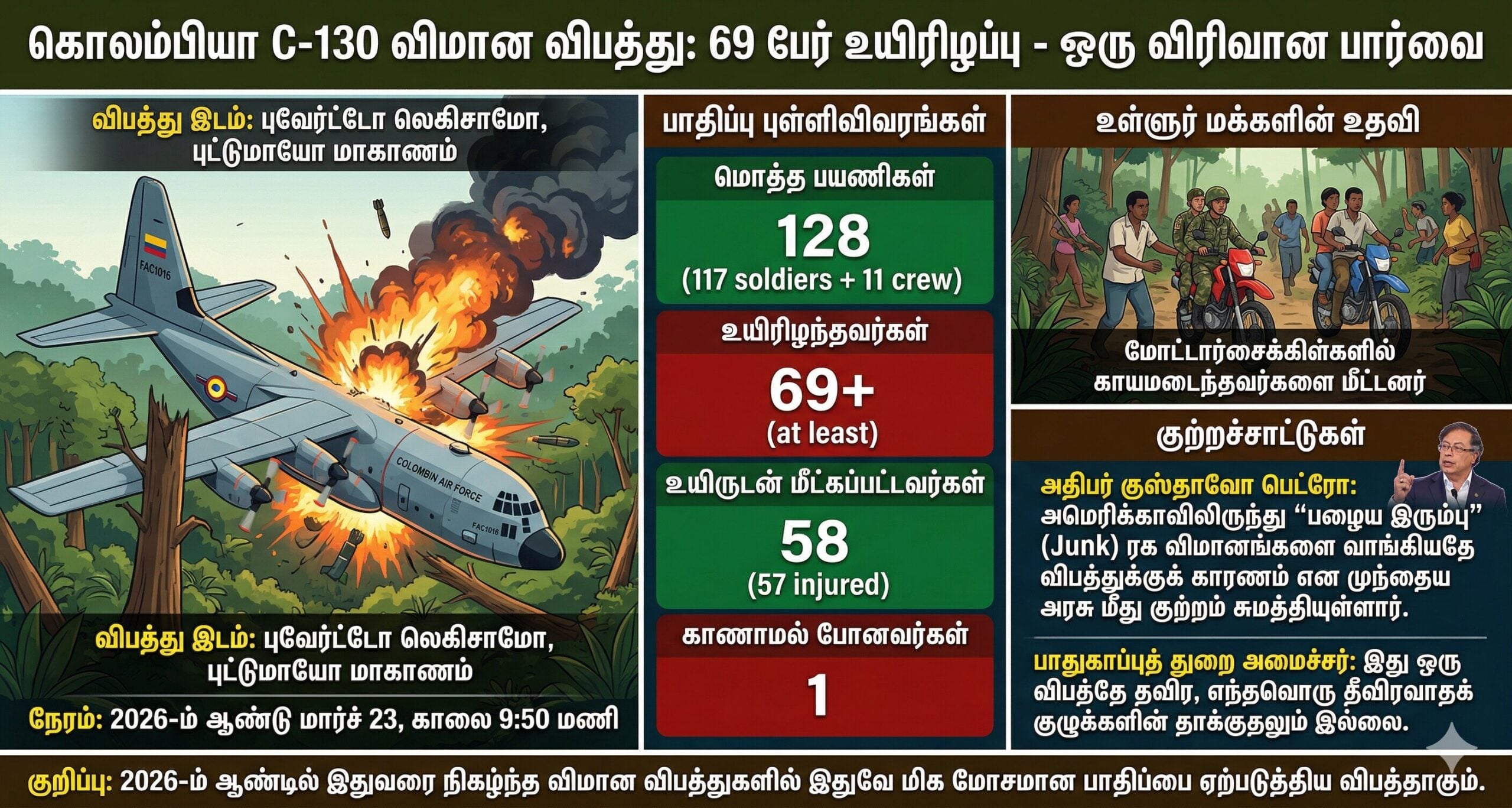 2026-ம் ஆண்டு மார்ச் 23 அன்று கொலம்பியாவின் புட்டுமாயோ (Putumayo) மாகாணத்தில் உள்ள புவேர்ட்டோ லெகிசாமோ (Puerto Leguízamo) அருகே நிகழ்ந்த இந்த சி-130 (C130) விமான விபத்து, அந்நாட்டின் ராணுவ வரலாற்றில் ஒரு கருப்பு நாளாக மாறியுள்ளது.