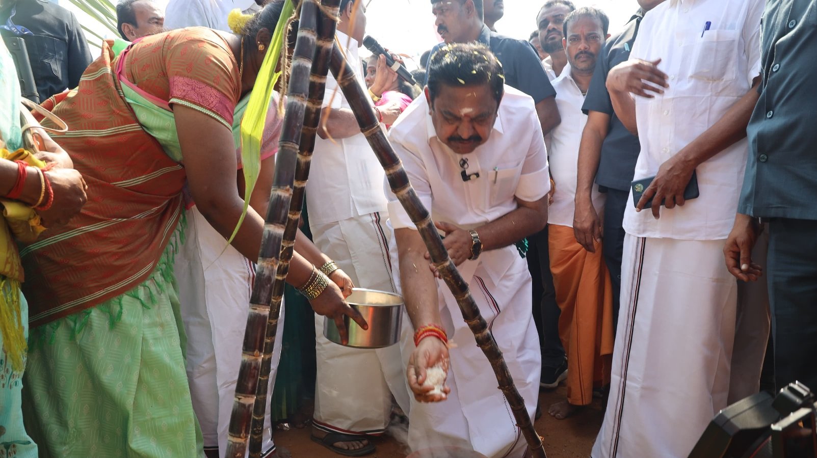 இதையொட்டி மாட்டு வண்டியில் வந்த எடப்பாடி பழனிசாமி, 108 பானைகளில் பொங்கல் வைக்கும் நிகழ்வை பானையில் பச்சரிசி இட்டு தொடங்கி வைத்தார்.