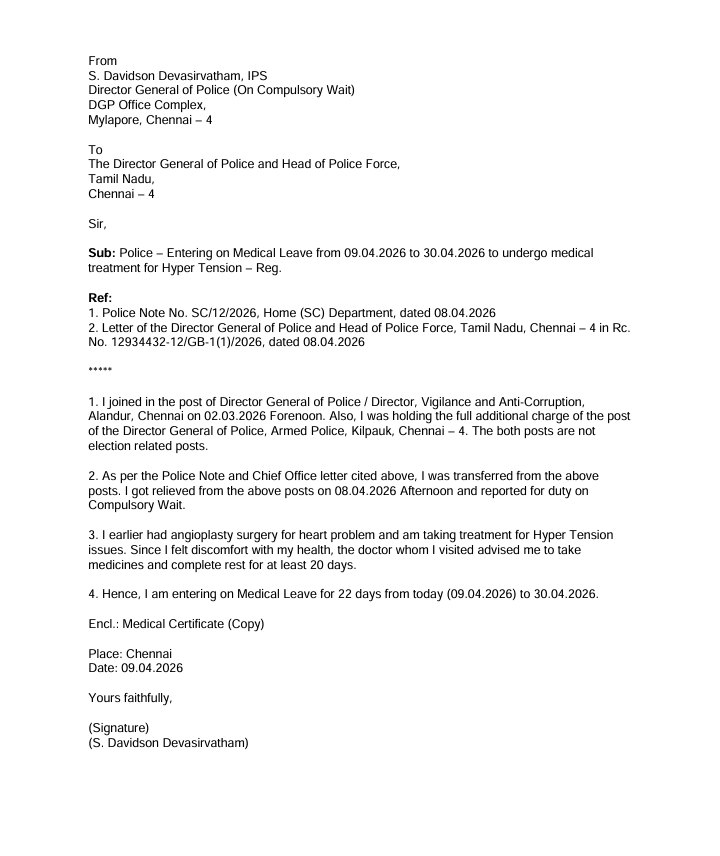 இதன் காரணமாக, ஏப்ரல் 9-ம் தேதி முதல் ஏப்ரல் 30-ம் தேதி வரை மொத்தம் 22 நாட்களுக்கு அவர் மருத்துவ விடுப்பில் செல்ல அனுமதிக்கும் வகையில் தமிழக காவல்துறை தலைமை இயக்குநருக்கு (DGP) கடிதல் எழுதி உள்ளார். இதற்கான மருத்துவச் சான்றிதழ்களையும் அவர் இணைத்துள்ளார்.