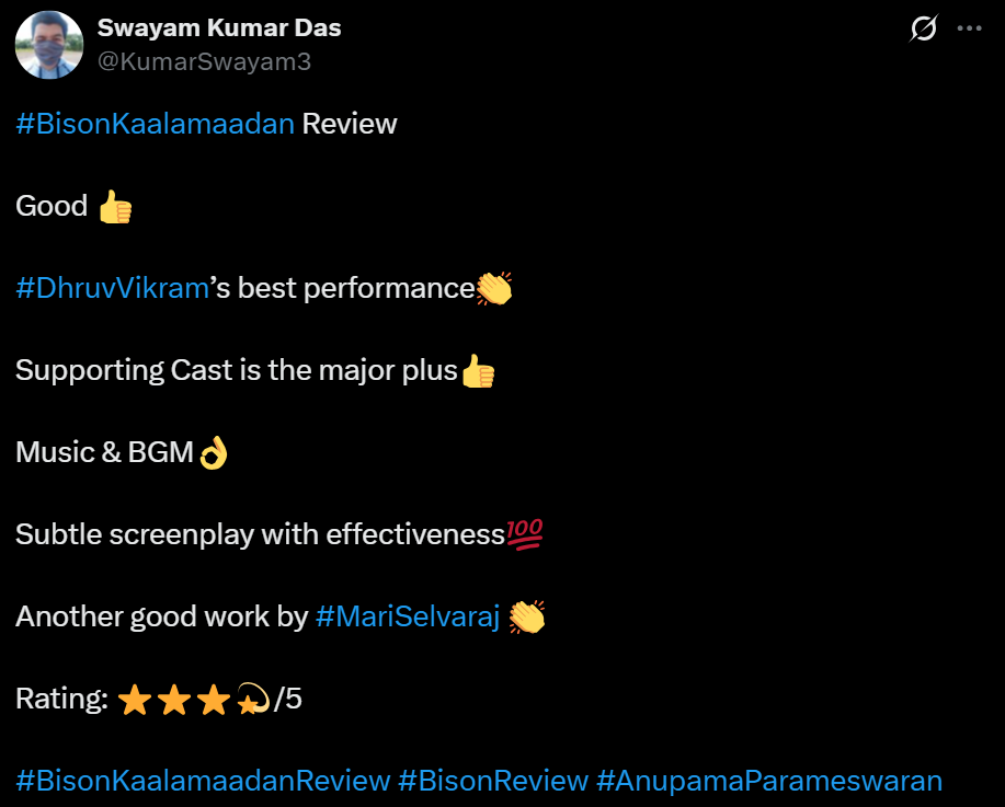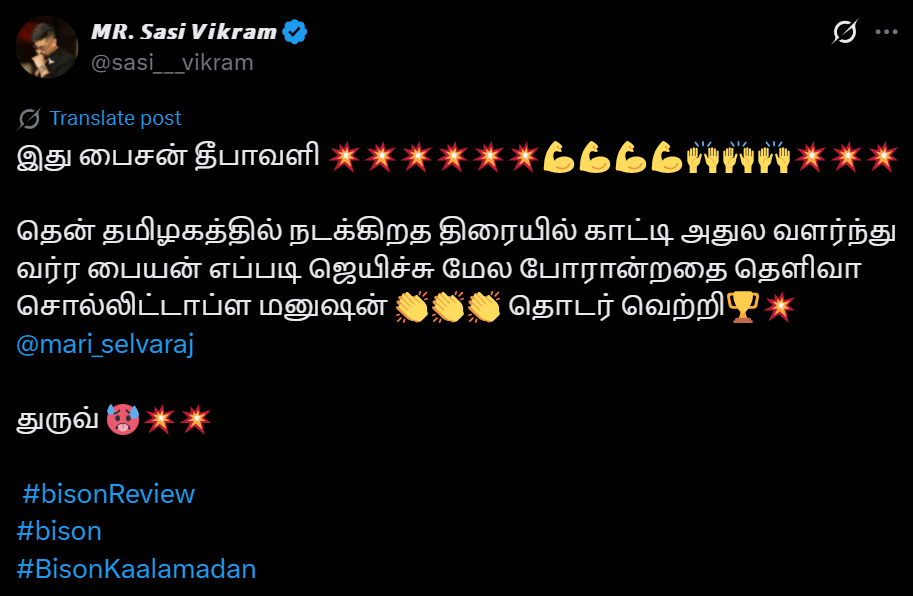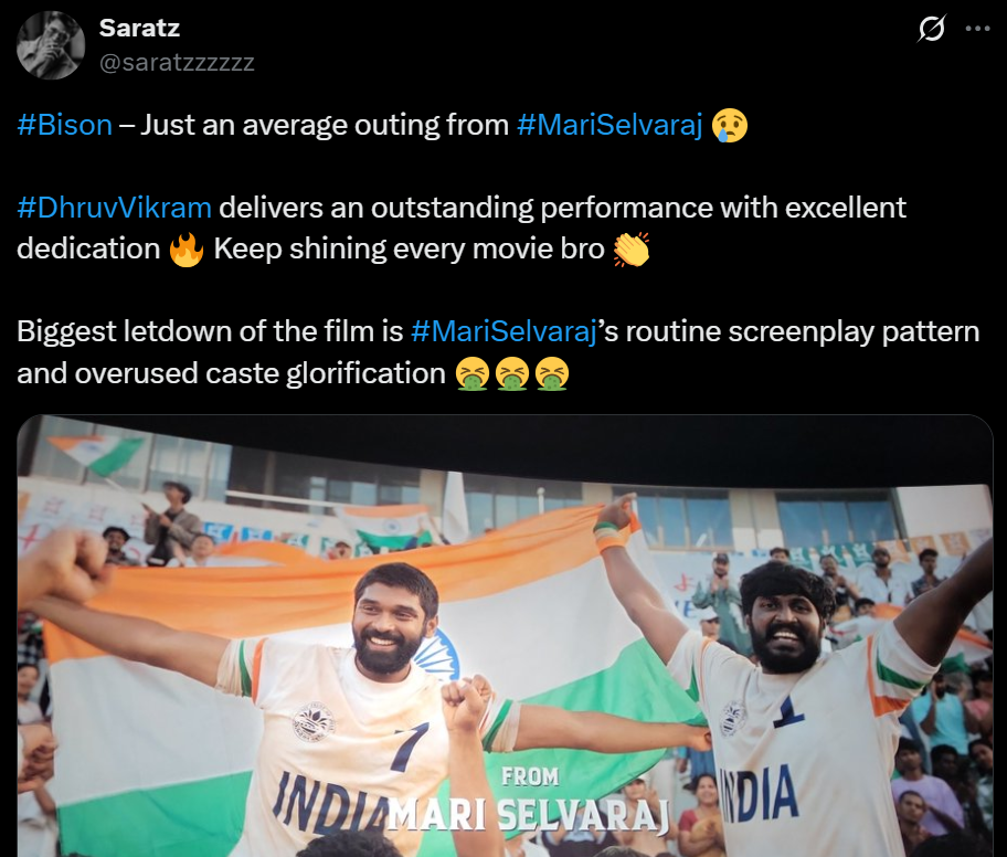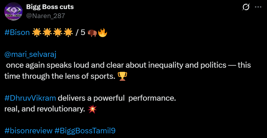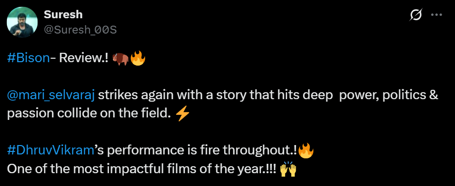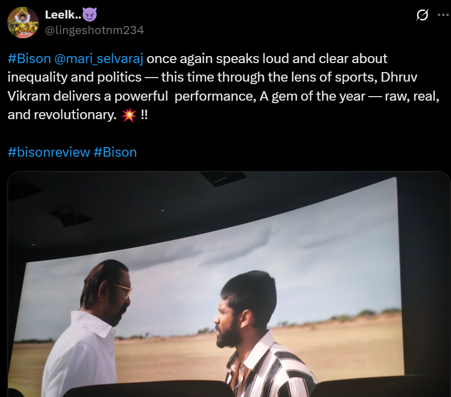 துருவ்விக்ரம் ஒரு சிறந்த நடிப்பை வழங்குகியுள்ளார்🔥👏🏻 இது உண்மையிலேயே மாரிசெல்வராஜின் சக்திவாய்ந்த படைப்பாக உணர வைக்கிறது. கதை அற்புதமாக வடிவமைக்கப்பட்டுள்ளது, ஒவ்வொரு கதாபாத்திரமும் அழகாக எழுதப்பட்டு நடிகர்களால் அற்புதமாக சித்தரிக்கப்பட்டுள்ளது. 2025 ஆம் ஆண்டின் சிறந்த படங்களுள் ஒன்று.