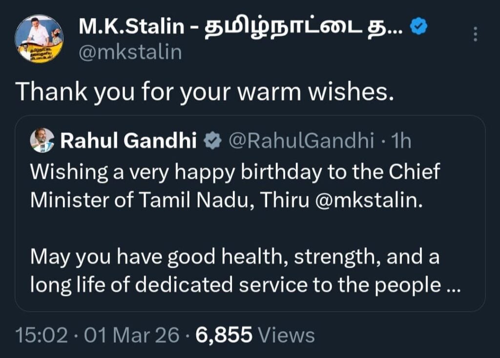 இன்னொரு இன்னைக்கு பகல் 1.34 மணிக்கு ராகுல் காந்தி ட்விட்டர் பக்கத்துல சிஎம் ஸ்டாலினுக்கு பிறந்த நாள் வாழ்த்து சொல்லி இருக்காரு.. அதுக்கு ஸ்டாலினும் நன்றி சொல்லி இருக்காரு..