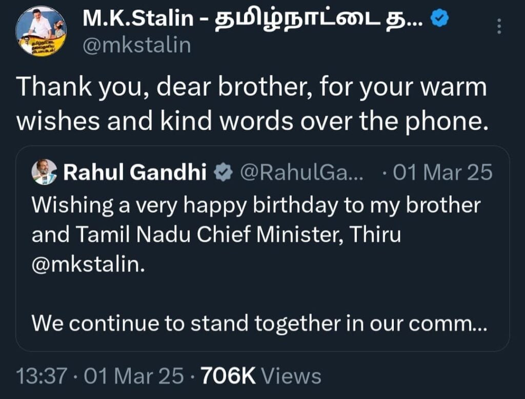 இருக்கே.. போன வருஷம் ஸ்டாலினுக்கு ராகுல் காந்தி பர்த் டே விஸ் பண்ணும் போது “ Wishing a very happy birthday to my brother and Tamil Nadu Chief Minister, Thiru @mkstalin. We continue to stand together in our commitment to preserve India’s rich diversity, federal structure, and Constitutional values”ன்னு அன்பா சொல்லி இருந்தாரு.. ரெண்டு பேரும் இணைஞ்சு செயல்படுவோம்னும் குறிப்பிட்டிருந்தாரு..