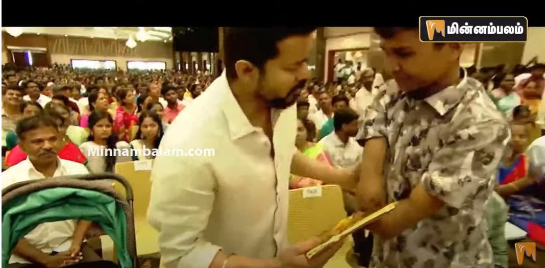 ரசிகர்கள் புடைசூழ மண்டபத்திற்குள் நுழைந்த விஜய் மாற்றுத்திறனாளி மாணவர்களுடன் வந்து அமர்ந்தார். அப்போது மாற்றுத்திறனாளி மாணவர் நடிகர் விஜய்யிடம் பரிசு ஒன்றை வழங்கினார். இந்த புகைப்படம் தற்போது சமூக வலைதளங்களில் வைரலாகி வருகிறது.