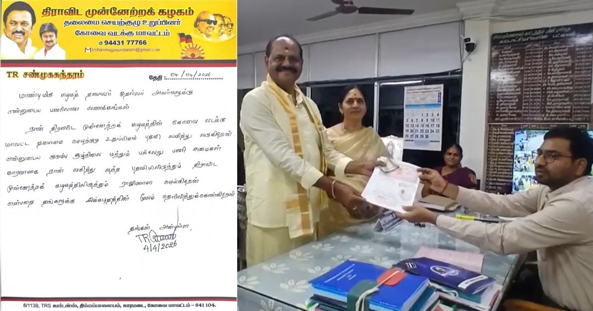 இன்று தனது ஆதரவாளர்கள் மற்றும் குடும்ப உறுப்பினர்களுடன் மேட்டுப்பாளையம் வட்டாட்சியர் அலுவலகம் வந்த டி.ஆர்.எஸ். சண்முகசுந்தரம் சுயேட்சையாக போட்டியிட வேட்பு மனுவை தாக்கல் செய்துள்ளது திமுகவினரிடையே அதிர்ச்சியை ஏற்படுத்தி உள்ளது.