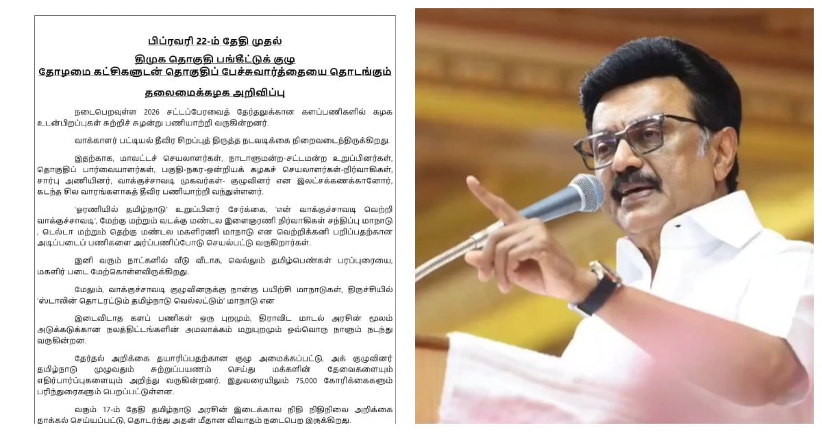 திமுக கூட்டணி கட்சிகளுடன் பிப்ரவரி 22-ந் தேதி முதல் தொகுதிப் பங்கீட்டு பேச்சுவார்த்தை நடைபெறும் என்று அக்கட்சித் தலைமை அறிவித்துள்ளது.