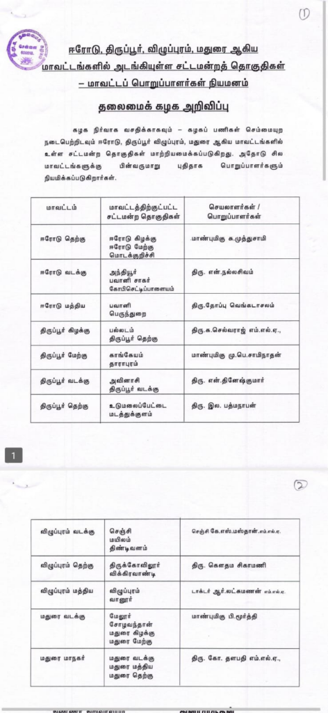 அதன்படி நியமனம் பெற்ற மாவட்ட பொறுப்பாளர்களின் விவரம் பின்வருமாறு,