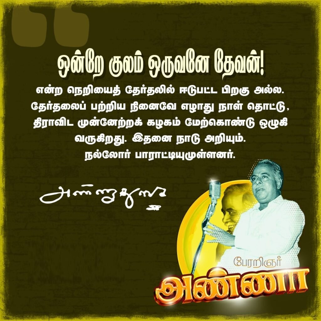 இந்த புரிதலை உணர்த்த தமிழ் சைவ ஞானி திருமூலர் கூறிய “ஓன்றே குலம், ஒருவனே தேவன்” என்ற வாக்கியத்தை தி.மு.க-வின் மத நல்லிணக்க தத்துவமாகக் கூறினார். இதனைப் பலர் பெரியாரின் இறைமறுப்பு வாதத்திலிருந்து வழுவிய சமரசமாகக் கருதினார்கள். அது அப்படியல்ல. இரண்டு பாதைகளின் நோக்கமும், ஆரிய வர்ண தர்மம் களைந்த சுயமரியாதைச் சமூகத்தைக் கட்டமைப்பதுதான் எனலாம். வரலாறு இதனை நிரூபித்துள்ளது.
