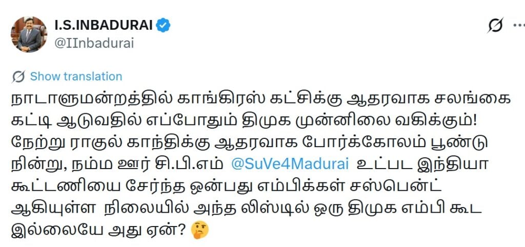 இந்த நிலையில் அதிமுக ராஜ்யசபா எம்.பி. இன்பதுரை தமது எக்ஸ் பக்கத்தில், ”நாடாளுமன்றத்தில் காங்கிரஸ் கட்சிக்கு ஆதரவாக சலங்கை கட்டி ஆடுவதில் எப்போதும் திமுக முன்னிலை வகிக்கும்! நேற்று ராகுல் காந்திக்கு ஆதரவாக போர்க்கோலம் பூண்டு நின்று, நம்ம ஊர் சி.பி.எம் சு.வெங்கடேசன் உட்பட இந்தியா கூட்டணியை சேர்ந்த எம்பிக்கள் சஸ்பென்ட் ஆகியுள்ள நிலையில் அந்த லிஸ்டில் ஒரு திமுக எம்பி கூட இல்லையே அது ஏன்?” என கேள்வி எழுப்பி உள்ளார்.