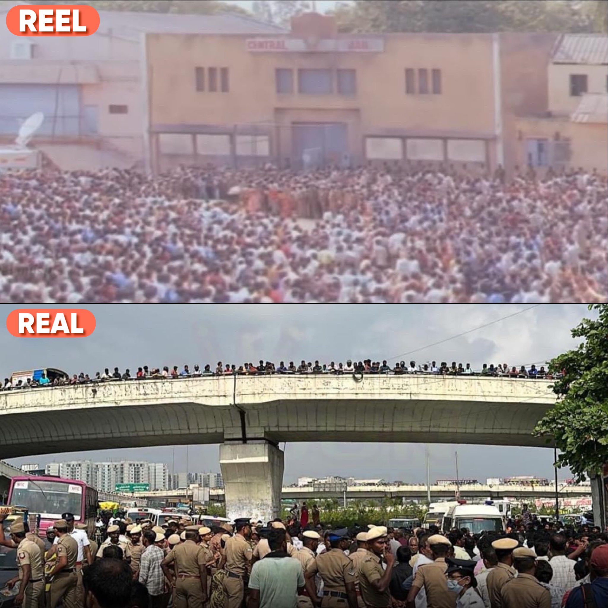 ரமணா படத்தின் இறுதிக்காட்சியில் இறந்த விஜயகாந்தின் உடலை காண, லட்சக்கணக்கான மக்கள் சிறைக்கு வெளியில் கூடி இருப்பது போல காட்சிகள் இருக்கும்.